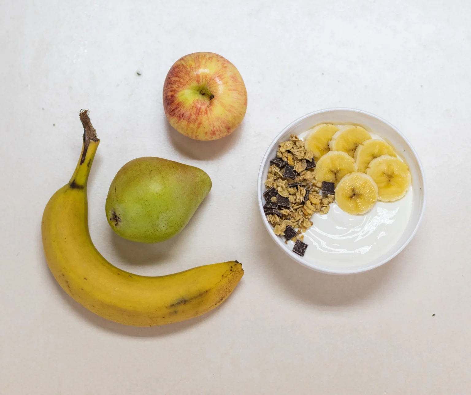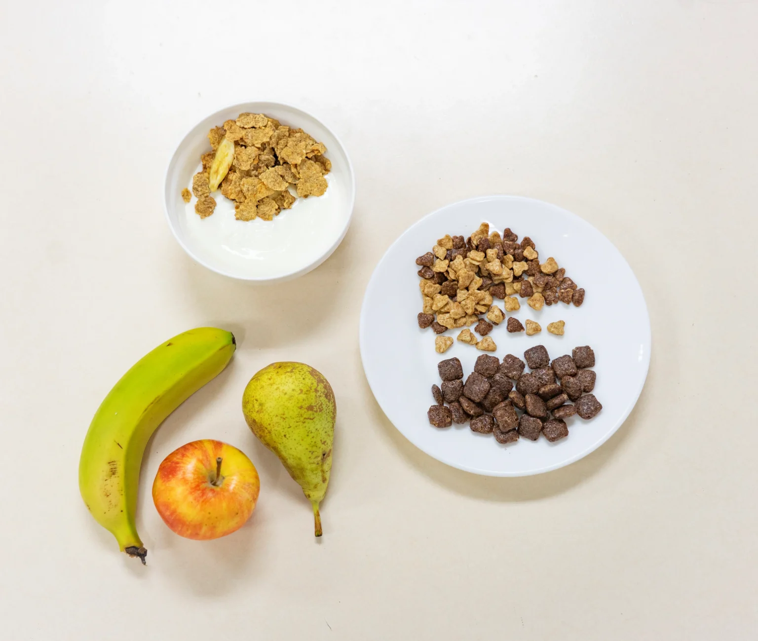 Yogur cremoso, cereales integrales y fruta de temporada.